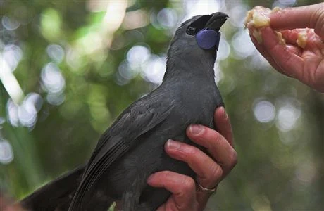 The North Island kōkako is a large, blue-grey songbird bird with distinctive bright blue wattles at its throat. Often heard more than seen, these birds belong to the ancient New Zealand wattlebirds family, which includes the extinct huia.