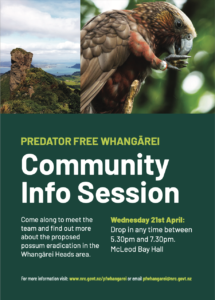 To help this project succeed, it will need the support of many – landowners, iwi/hapū, Landcare groups, conservation groups, communities, schools, whānau, businesses and more. The Predator Free Whangārei team has been busy notifying the 1,845 landowners in the Whangārei Heads area, and aim to have met with the majority of landowners located between Bream Head and Ody Road by the end of May with onsite meetings, follow up emails and phone calls and community information sessions.